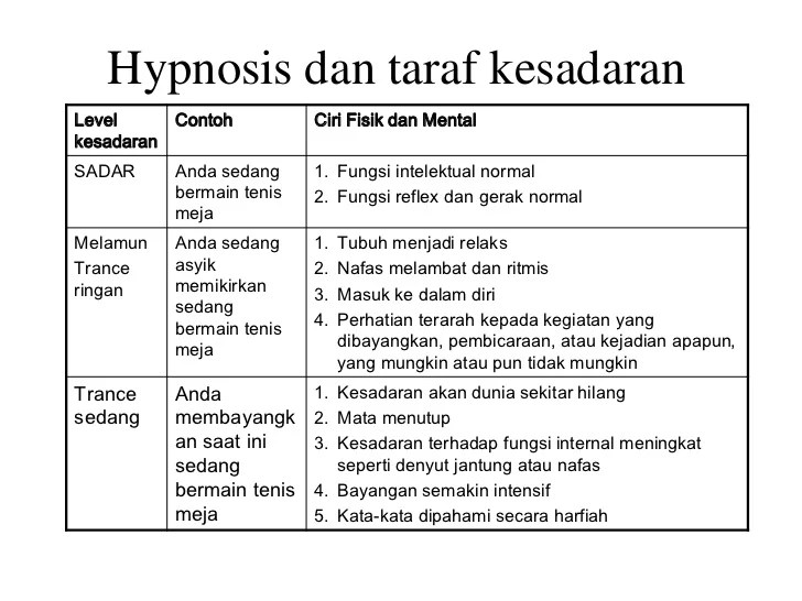 Kesimpulan yang dapat diambil dari beberapa pendapat diatas bahwa kecemasan. Hipnotis dalam proses pembelajaran dikenal dengan istilah hypno teaching. Stress dan kecemasan, fakultas kedokteran universitas gadjah mada,. Catatan sejarah tertua tentang hipnosis yang diketahui saat ini berasal dari ebers papyrus yang menjelaskan teori dan praktik pengobatan . Oleh karena itu, begitu banyak pengertian hipnotis yang muncul.
